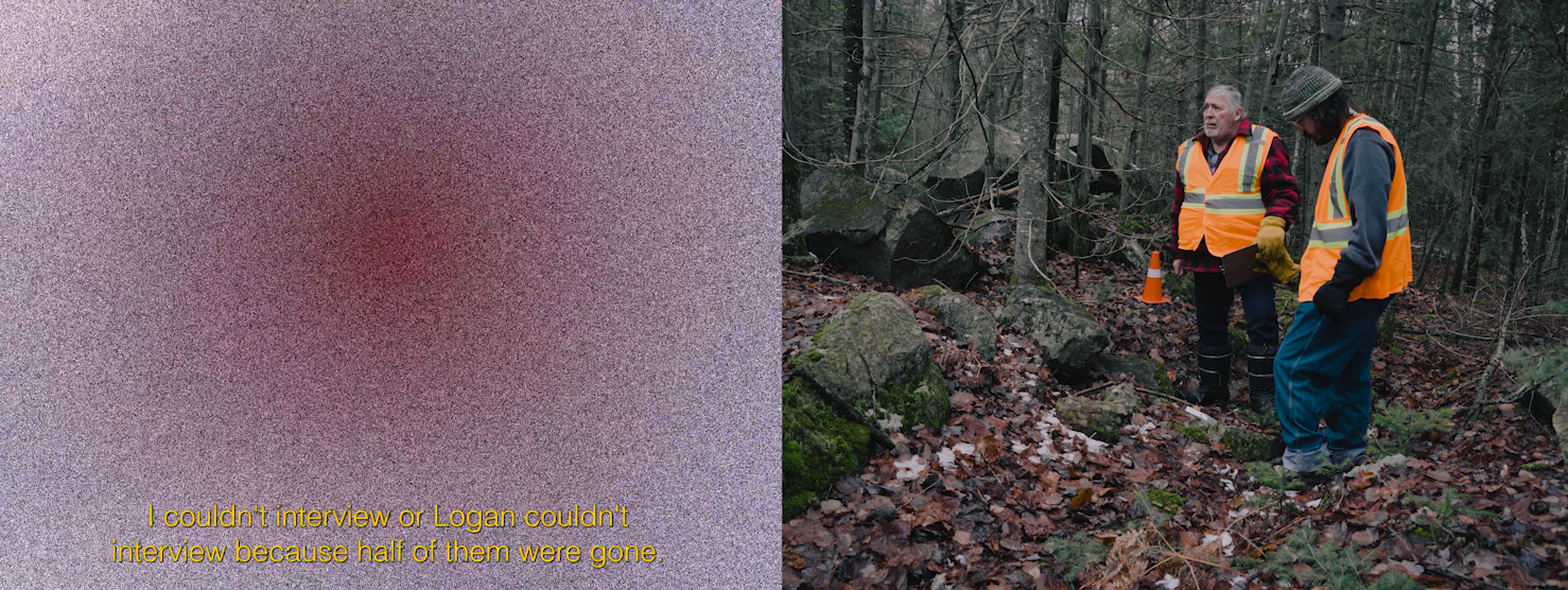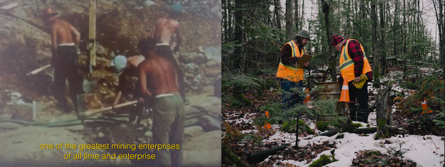 Channel B: Video performance (2025) of the artist and his maternal grandfather returning to investigate the site of uranium discovery in Elliot Lake, exploring the radioactive legacy of the town where his grandfather was exposed to radiation working in discovery diamond drilling. Dawning geiger counters and clipboards, the two revisit the site, and in doing so confront the inter-generational traumas of radiation, grappling with the idea of home in the face of poisoned land. Combined with narration, the artist and his grandfather provide a counter-narrative to government and private remediators, who have historically under-represented the dangers of radioactivity on workers, community members, and the land.